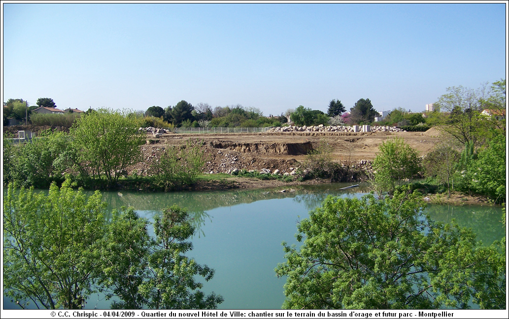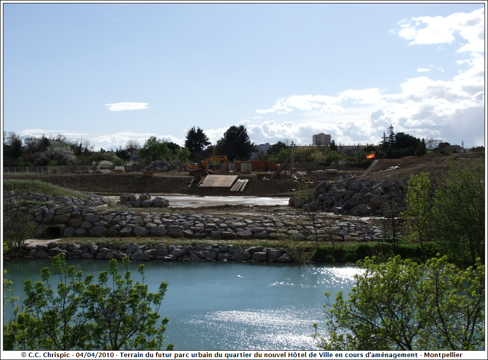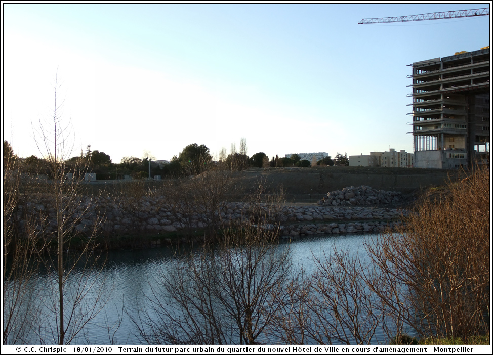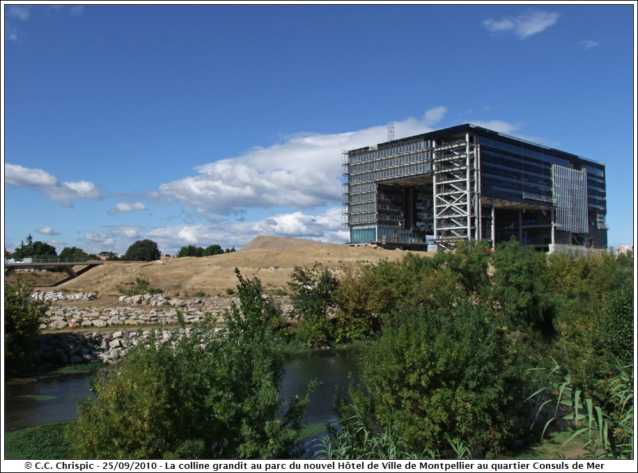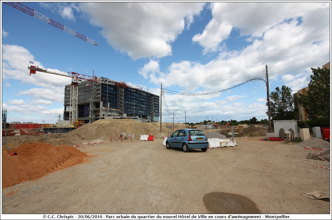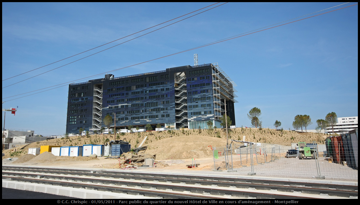 Sur cette page, des photos de l'évolution de l'aménagement du terrain qui entoure le nouvel Hôtel de Ville de Montpellier, surtout derrière celui-ci. C'est un parc public paysagé qui forme une petite colline. La terre utilisée pour former cette colline provient du terrassement du parking souterrain du nouvel Hôtel de Ville, elle était entreposée sur le terrain de la ZAC Rive Gauche en attendant (par contre, je ne sais pas si la terre utilisée provient uniquement de la ou bien d'ailleurs aussi). Le nouvel Hôtel de Ville ne serait pas complet sans ce parc, il le complète parfaitement en offrant un magnifique contraste entre le bleu métallique et moderne du bâtiment et le vert naturel du parc. Au même titre que le bâtiment, j'adore ce parc, très intéressant à suivre son évolution, un vrai océan de verdure en bordure du Lez qui met en valeur l'HDV et offre une reposante ballade dans ce lieu très urbain.