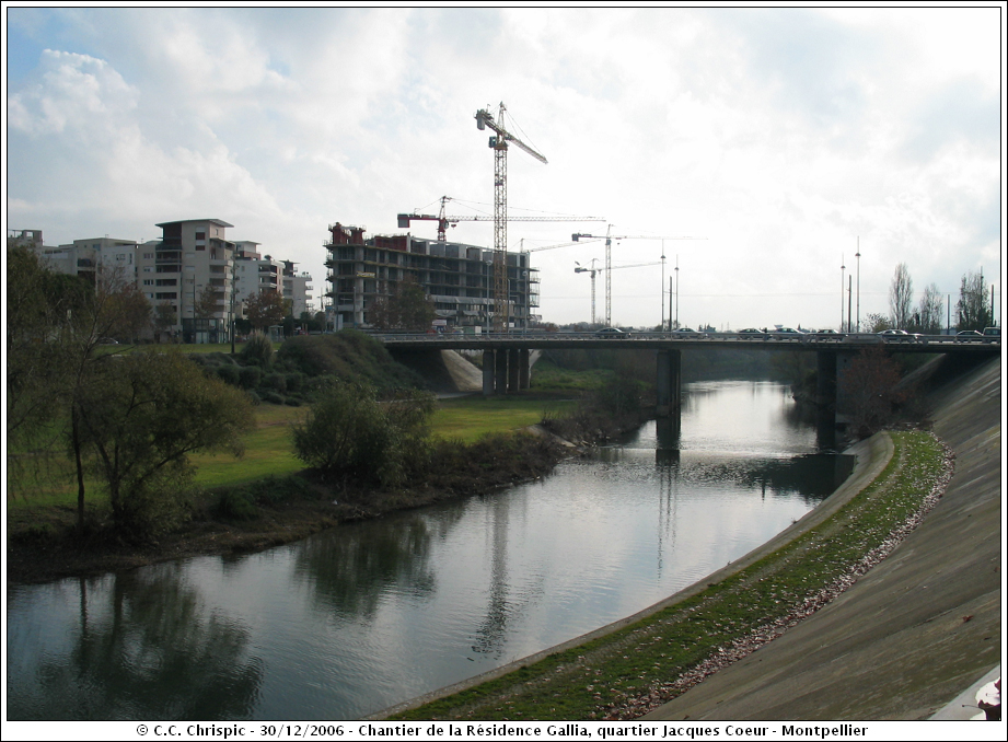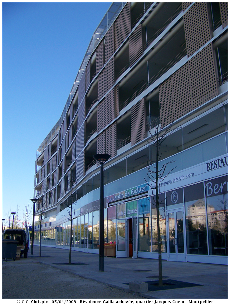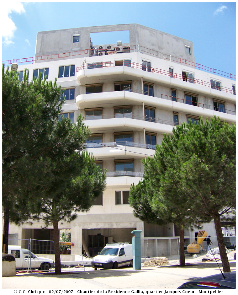 La résidence Gallia se situe dans le quartier Jacques Coeur, sur la rive nord du bassin Jacques Coeur. Son emplacement est idéal : au bord du fleuve Le Lez, face au nouvel Hôtel de Ville. J'aime beaucoup sa forme et son architecture, on dirait un bateau posé avec ses deux cheminées sur le toit. Très bel immeuble!