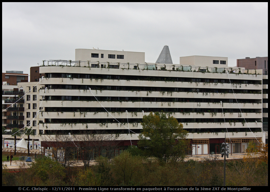 Immeuble en bordure du Lez, c'est le pendant de la résidence Port Pallas. Un paquebot en bordure du Lez, voila ce que j'y vois! Ses lignes épurées, sa proue, ses maisons sur le toit, sa cheminée... tout est fait pour donner cette impression de bâteau. On note la présence sur l'ensemble du bâtiment de végétation (plantes qui pendent). Au final, un projet bien sympa. Mon seul regret, les maisons sur le toit sont peintes en blanc et non en gris comme les rendus le laissent voir : cela rend la cassure entre les 6 niveaux et les maisons sur le toit moins prononcée que sur les autres immeubles du quartier, dommage.