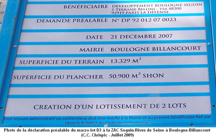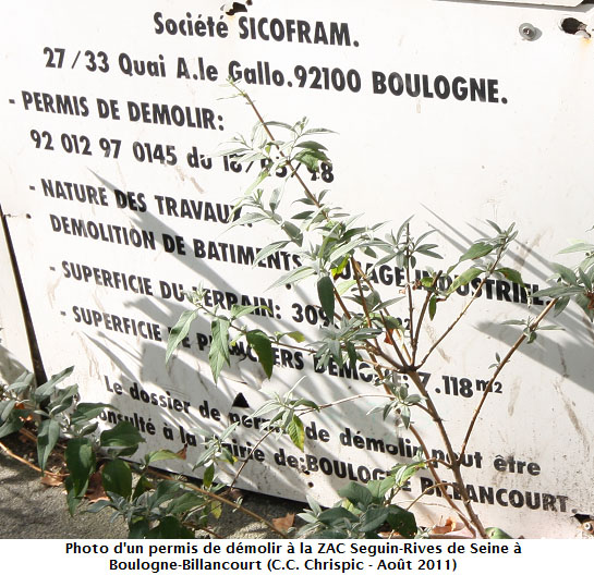 Macro-Lot A4 : N° DP92012100737 Macro-Lot B2 : N° PL92012060006 Macro-Lot B3 : N° PL92012060007 Macro-Lot B4 : N° PA92012100001 Macro-Lot D3 : N° DP92012070023 et Transfert Macro-Lot V : N° DP092012080253 et N° DP092012090346 Permis de démolir quartier du Pont de Sèvres : N° 92012090873 et N° 92012080854 Projets avortés de L'Île Seguin : Hôtel Intercontemporain Université Américaine de Paris (Bât. d'enseignement) Université Américaine de Paris (Résidence étudiante) Résidence pour chercheurs et artistes Permis de démolir des bâtiments industriels de L'Île Seguin : 1 | 2 | 3 Permis de démolir des bâtiments industriels du Trapèze : 1 | 2 | 3 | 4 | 5 | 6 | 7 | 8 | 9 | 10 | 11 | 12 | 13 | 14 Parc de Billancourt : N° 92012081607 Permis de démolir du pavillon d'information sur le Macro-Lot A4 : N° 92012110889 Divers : N° PD92012100882 et N° DP92012100630 Pour le reste, se référer aux pages des chantiers de la ZAC dans le menu déroulant. |