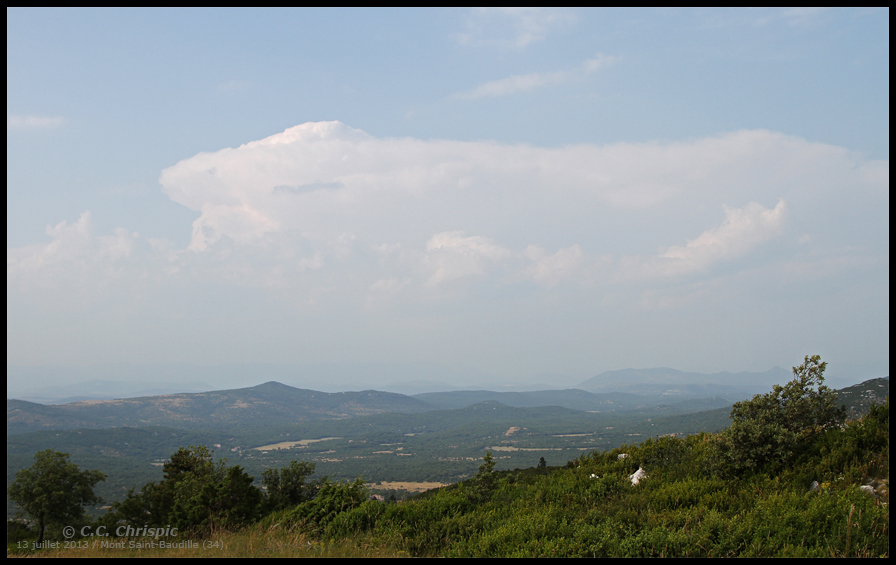 13 juillet : vendredi, une petite convection s'enclenche sur les Cévennes mais s’effondrera rapidement, c'est une journée sans, un peu de repos! Samedi 13, un risque orageux sur les reliefs est à nouveau présent, avec védasien et NIKO34 nous repartons au Mont Saint-Baudille. Comme il y a deux jours, une cellule orageuse particulièrement intense et relativement stationnaire se développe sur les reliefs de l'Ouest héraultais. Son enclume vient encore nous chatouiller mais elle est moins compacte. Arrivés là haut, nous avons donc cela à l'Ouest et de beaux cumulonimbus en Lozère. La convection prend plus proche devant nous mais n'arrivera jamais à aller ne serait-ce qu'au stade de cumulus congestus. Côté Lozère, les orages se reforment en permanence, la vue est parfaite... quel dommage qu'il ne fasse pas nuit, le bouillonnement s'illuminerait de manière splendide. Cette convection lozérienne s'effondrera avant la tombée de la nuit, côté Ouest le voile nuageux s'épaissit (non plus à cause de l'orage héraultais qui est mort mais certainement par tous les orages énormes du sud-ouest qui développent à leur tour une immense enclume) -> nouveau flop pour la foudre! Pour la route, deux photos de la convection lozèrienne.