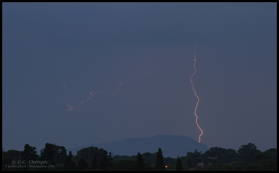 7 juillet : aucun orages prévus dans le coin... et pourtant! Pendant que les Alpes du Sud sont à la fête avec de gros orages, une ligne instable se forme en fin de journée à l'Ouest de Montpellier, non loin du massif de la Séranne. Un cumulonimbus parvient à se former et lachera 2 ou 3 coups de foudre mais ne me laissera pas le plaisir de voir le soleil passer derrière l'enclume : on y était presque! Le CB se décompose mais l'instabilité reste présente avec des précipitations plus à l'Ouest. Dans la continuité, une enclume se dévoile dans les Cévennes : des orages se forment sur le Gard et descendent lentement en direction du Nord-Est héraultais. La capture photo se fera à domicile compte tenu du jour et du doute quant à la survie de ces cellules orageuses. C'est dans la chaleur d'une nuit d'été et au calme que j'assisterais à ce spectacle nocturne inattendu, une évolution diurne qui déborde dans la nuit. Les derniers impacts, les plus proches non loin d'Aniane, signent la fin de l'orage puisque tout se désactivera quelques minutes plus tard. Une belle surprise pour ce dimanche et la semaine s'annonce intéressante, enfin!