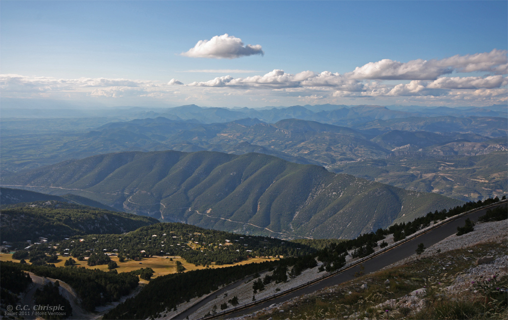 Du haut de ses 1 912 mètres d'altitude, le Mont Ventoux est le point culminant du département du Vaucluse. Il se situe dans le Sud-Est de la France, dans le région Provence-Alpes-Côte d'Azur. Du fait de sa hauteur et du relief bien plus bas aux alentours, le Mont Ventoux est visible de très loin (on peut le voir du littoral montpelliérain) et offre une vue à 360° à son sommet (par temps clair le Mont Blanc est visible). En juillet 2011, j'ai eu l'occasion d'y aller et j'ai donc naturellement pris des photos. Après un après-midi sous la chaleur estivale d'Avignon, le contraste a été important une fois arrivé au sommet : pas plus de 12°c avec un petit vent glacé, on est bien en montagne! Les cumulus présents dans le ciel offraient un beau décors en plus du paysage et du ciel bleu, mais malheureusement, la couche nuageuse était trop importante vers les Alpes et m'a empêché d'apercevoir le Mont Blanc. Toutefois, les neiges estivales des derniers jours étaient visibles sur plusieurs sommets alpins. En se retrouvant si haut et avec une telle vue, je ne pouvais qu'imaginer ce que doit être la vue d'évolutions diurnes depuis ce sommet... ça doit valoir le coup! Place aux photos :