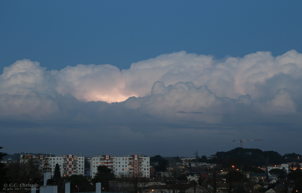 En cause, une goutte froide d'altitude en provenance d'Allemagne venant se caler sur les Pyrénées. Jeudi 26 janvier, c'est un coup double qui se joue : neige à basse altitude en Languedoc-Roussillon et Vallée du Rhône et orages sur les rivages méditerranéens. Entendre le tonnerre raisonner à une telle date est un plaisir, l'hiver n'étant que peu propice à ce phénomène (plus courant sur le littoral provençal tout de même). Les orages de la mi-journée étaient très pluvieux et donc peu exploitables. À la sortie du boulot, je vais faire un tour dans les environs du Pic Saint-Loup, la neige a déjà bien fondu par rapport à la mi-journée mais une couche reste présente au-dessus de 300 à 400m d'altitude. Le soir, de nouveaux orages se forment sur le secteur de Nîmes dans le Gard, le long d'un bel axe convectif visible de Montpellier. L'activité orageuse ne prendra pas plus proche dans la nuit malgré une convection toujours en bonne forme :